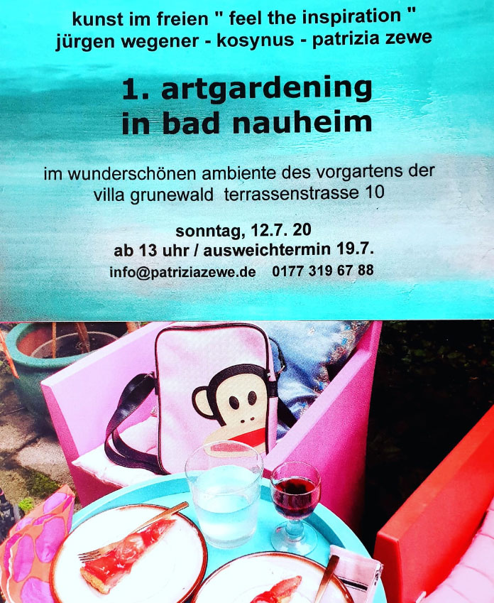 | 9. juli 2020 Unsere Hinterhofgalerie öffnet zum artweekend am Freitag , 31. 7 . 2020 ab 14 uhr … sa / so von 14 – 19 uhr HINTERHOFGALERIE im „ creme de la creme „ Fussgängerzone in Bad Nauheim Freitagabend um 18 uhr spielen die „ singing sixties „…. Herzlich Willkommen ! Art will save the world ----Art will save our soul ! Ausgestellt werden Objekte , Mixedmedia, Fotografie u Malerei von kosynus, jürgen wegener u patrizia zewe ![]() ![]() ![]() ![]() |